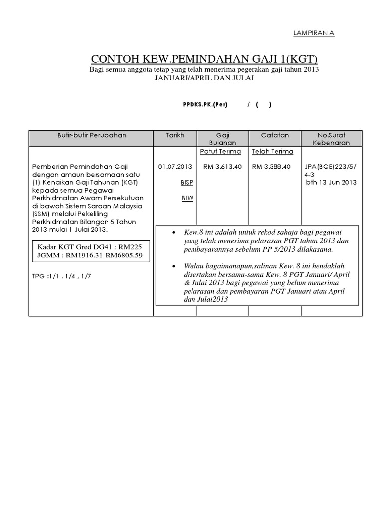 Kenaikan Gaji Gred 54 Malaycass from lh5.googleusercontent.com Ii) kadar kenaikan gaji tahunan (kgt) terakhir diterima di gred terdahulu, mengikut mana yang lebih tinggi, mulai tarikh kenaikan pangkatnya. Dan ianya ditambah dengan kadar kenaikan gaji tahunan (kgt) berdasarkan gred, terhad kepada amaun gaji maksimum dalam jgmm terbaharu iaitu tahun 2016. Kaedah pemberian gaji tahunan sedia ada adalah mengikut gaji tetap pegawai. Kadar elaun mengikut gred gaji. Kadar kgt di gred kenaikan pangkat; Gaji awal bermula pada gred j19 ditetapkan mengikut kategori sijil kekompetenan Pegawai yang lantikan tetap pertama dalam perkhidmatan awam sebelum 31.8.2005 : Setiap tahun gaji akan berubah mengikut kenaikan gaji tahunan.