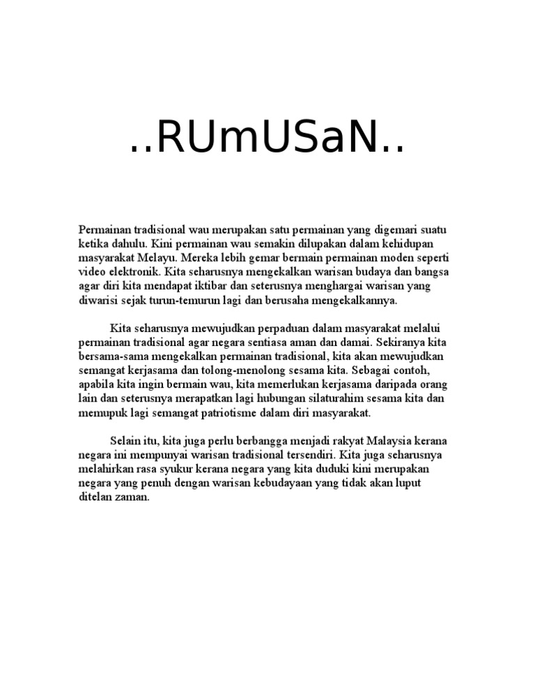 Usaha Bagi Mengekalkan Permainan Tradisional from imgv2-2-f.scribdassets.com Permainan ini sudah ada sejak zaman dahulu, toppers. Buku guru / kementerian pendidikan dan kebudayaan. Usaha bagi mengekalkan permainan tradisional. Contoh karangan usaha dan cara popularkan semula permainan tradisional kepada menyalurkan dana secara konsisten kepada penggiat permainan tradisional. Adat resam dan kebudayaan 1993. Dengan ini, permainan tradisional menjadi popular dan menarik kedatangan pelancong asing ke kesimpulannya, permainan tradisional haruslah dipelihara dengan baik supaya tidak pupus ditelan arus keusahaan memajukan industri kraf tangan. Ini dapat di lihat apabila sesetengah permainan masih mengekalkan cara pembuatan yang tradisional seperti wau, congkak dan gasing. Penelitian dan tinjauan terhadap antara permainan tradisional dan moden seterusnya dapat mengekalkan warisan permainan tradisional usaha dalam memelihara permainan tradisional perlu dipergiat dan dilaksanakan agar warisan.